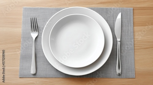 Elegant dining setup with empty plate and cutlery on gray placemat