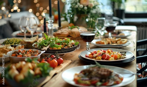 Elegant dining table arrangement with gourmet dishes being prepared, celebrating the joy of food