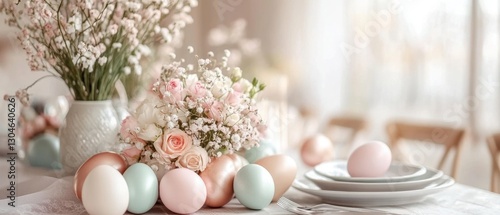 Elegant Easter Table Setting with Pastel Colored Eggs and Floral Centerpiece in Soft Light for Festive Celebration