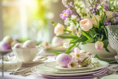 Elegant Easter Table Setting with Pastel Decor, An elegant Easter table setting featuring pastel eggs and a charming spring flower arrangement in soft tones.