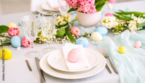 Elegant Easter Table Setting with Pastel Eggs Flowers and Crystal Wine Glasses.