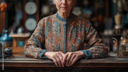 Elegant Elderly Woman in Vintage Clothing at Counter