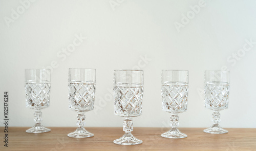 Elegant empty crystal glasses with high stem on the brown wooden table. Close-up. Copy space. Selective focus.