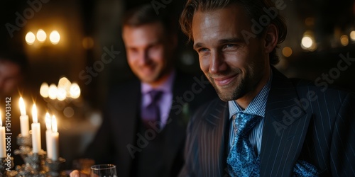 Elegant evening gathering at a luxurious venue with gentlemen enjoying drinks and fine dining