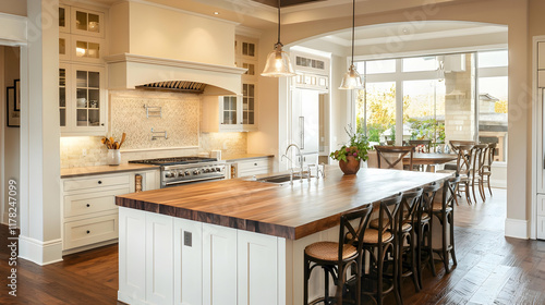 Elegant Farmhouse Kitchen: Warm Wood Island, Bright Sunlight, Classic Design
