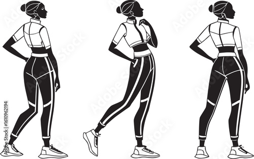 Elegant fashion silhouettes of three stylish women in sophisticated black and white suits posing confidently against a white background
