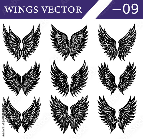 Elegant Feather Wings Vector Pack – Black Angel and Demon Silhouettes in Gothic Style for Tattoo Art and Fantasy Digital Design Projects.