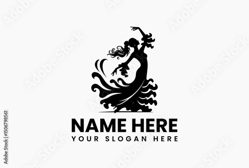 Elegant female dancer's silhouette in dynamic pose with flowing, artistic dress pattern. Dance and Art Concept