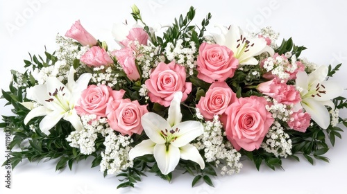 Elegant floral arrangement with pink roses white lilies and baby’s breath on a clean white background perfect for any occasion or celebration