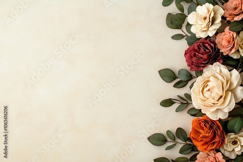 Elegant floral arrangement with vibrant roses and lush greenery on a textured background, perfect for invitations or decor.