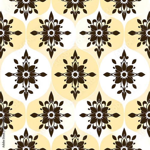 Elegant Floral Pattern: A seamless repeat pattern featuring dark brown stylized flowers on a pale yellow and white background. Perfect for textile design, wallpaper, and surface design.