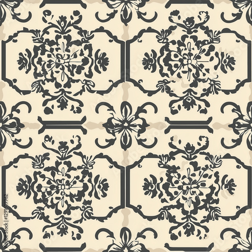 Elegant floral pattern in black and cream, featuring intricate designs and classic motifs.