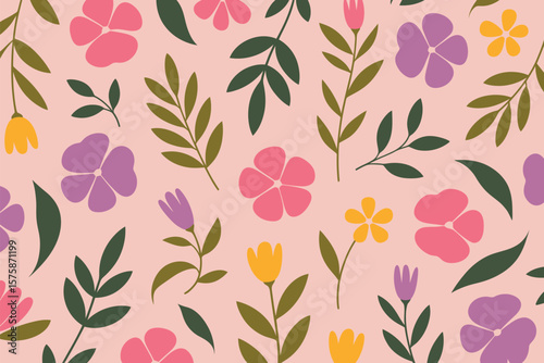 Elegant floral pattern showcasing colorful flowers and leaves on a pink backdrop, adding a touch of nature and vibrancy.