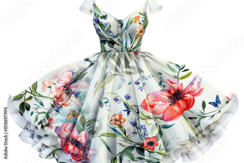 Elegant floral print cocktail dress with ruffled layers and vibrant colors, perfect for summer events and special occasions.