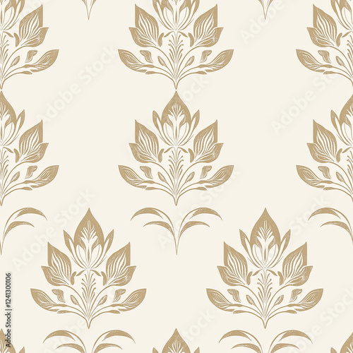 Elegant floral wallpaper pattern with intricate designs in soft gold on a light cream background, perfect for interior decor.