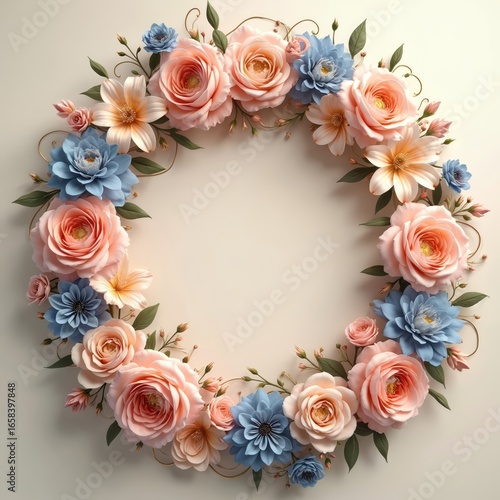 Elegant floral wreath pink roses, blue flowers in baroque vintage style. Delicate ornamental design with leaves, thin gold swirls on light background. Ideal for wedding invitations, greeting cards,