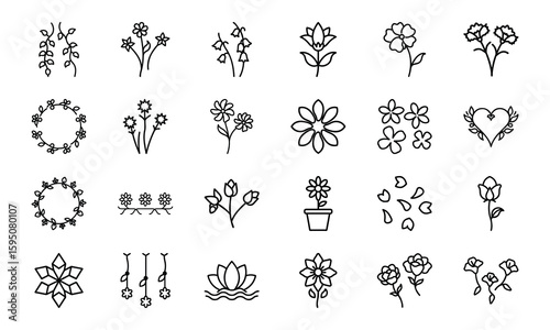 Elegant Flower Icon Collection Featuring Blossoms, Bouquets, Wreaths, Potted Plants, Petals, And Decorative Floral Elements In S (14)