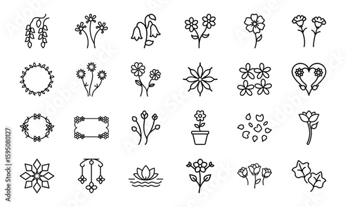 Elegant Flower Icon Collection Featuring Blossoms, Bouquets, Wreaths, Potted Plants, Petals, And Decorative Floral Elements In S (16)