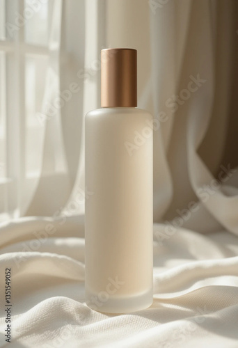 Elegant Frosted Glass Perfume Bottle with Matte Rose Gold Cap – Luxurious Product and Cosmetic Photography.