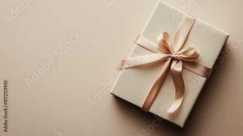 Elegant gift box with beige ribbon on neutral background
