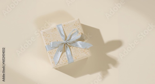 Elegant Gift Box with Gold Accents and Light Blue Ribbon, Studio Shot on Beige Background