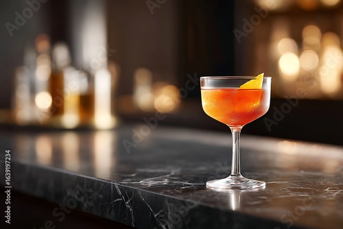 Elegant glass of red-orange cocktail resting on polished dark marble bar