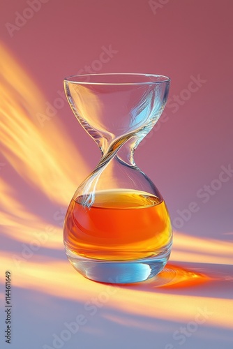 Elegant glass vase resembling hourglass with orange liquid and soft lighting
