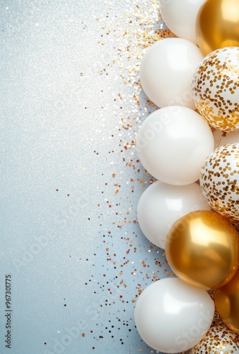 Elegant gold and white balloons on the right, surrounded by shimmering confetti, with a clean, free space on the left for text