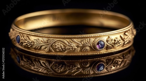Elegant Gold Bangle Bracelet with Intricate Floral Design and Gemstones
