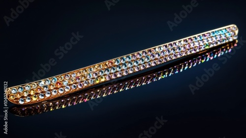 Elegant gold barrette adorned with colorful crystals on a reflective surface