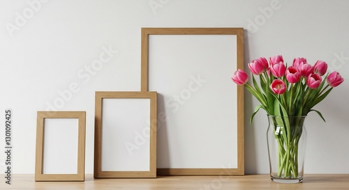 Elegant gold frames showcase vibrant pink tulips soft light. AI Generated