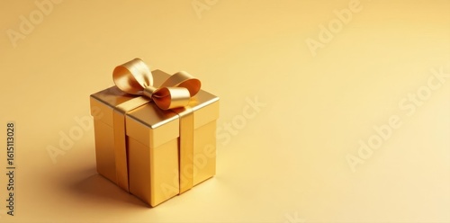 Elegant gold gift box with satin ribbon and bow, beige background , photo, wedding, backdrop