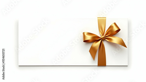 Elegant gold ribbon bow adorns a pristine white gift card, perfect for special occasions. A symbol of celebration and gifting.