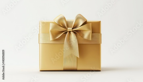 Elegant golden gift box with shiny bow on neutral background for celebrations and special occasions