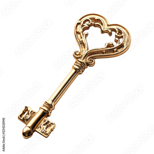 Elegant Golden Key with Heart Shaped Head on Isolated