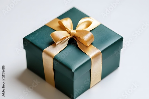 Elegant green gift box with golden ribbon and bow on a clean white background studio shot