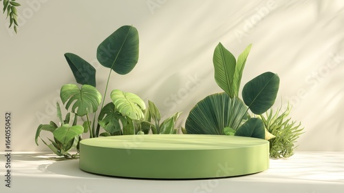 Elegant Green Product Display Podium Surrounded by Lush Tropical Foliage, Ideal for Beauty and Wellness Showcase