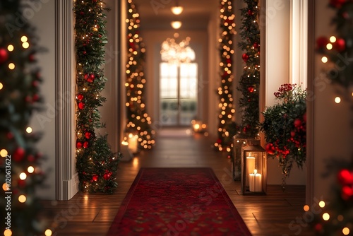 Elegant Hallway with Festive Garlands Lights and Accents in 3D