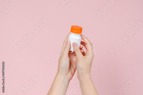 Elegant hand holding blank bottle mockup on pink background. Package for cosmetics product, nutritional supplements, vitamins, spa, beauty and luxury. Space for text