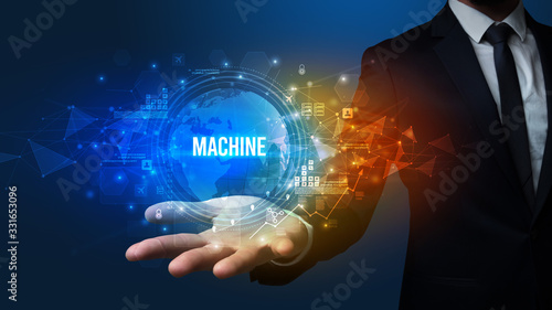 Elegant hand holding MACHINE inscription, digital technology concept