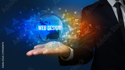 Elegant hand holding WEB DESIGN inscription, digital technology concept