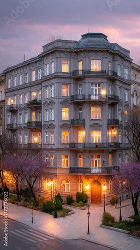 Elegant Historical European Building Facade Illuminated at Twilight with Warm Interior Lights and Blooming Cherry Trees Lining the Street Below
