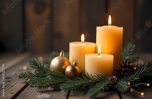 Elegant holiday decorations with gold ornaments and candles on a wooden table in a cozy setting. Christmas illustration