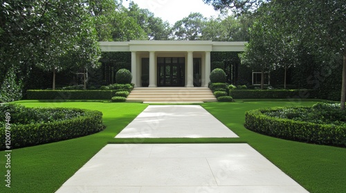 Elegant Home Exterior with Lush Landscaping and Walkway