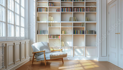 Elegant home library with tall bookshelves, a cozy armchair, and abundant natural light creating a serene and inviting space for reading and relaxation