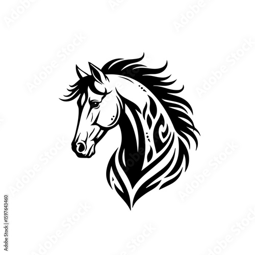 Elegant horse head silhouette with tribal patterns and flowing mane, showcasing strong features and artistic lines. Artistic representation of horse for various design applications,