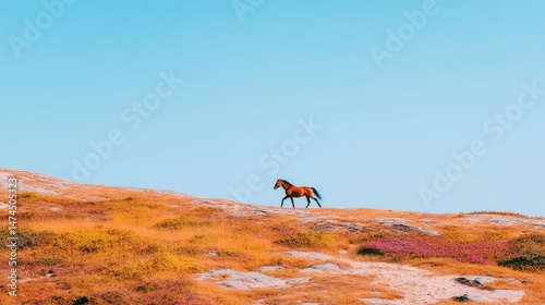 Elegant horse walking across vibrant landscape with blue sky and colorful foreground