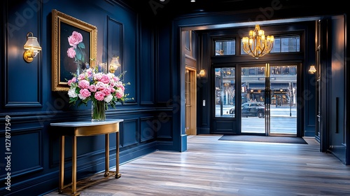 Elegant hotel lobby with floral arrangement, stylish decor and modern ambiance in urban setting