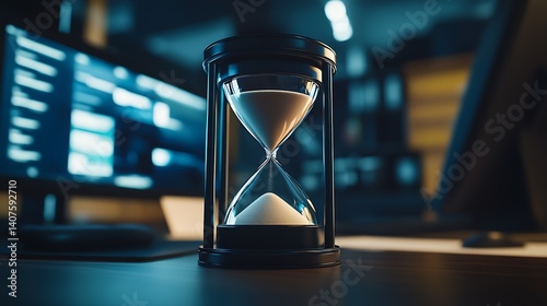Elegant hourglass filled with white sand symbolizing time management in a modern office setting : Generative AI