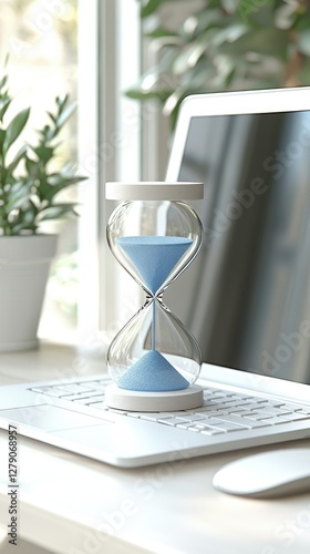 Elegant hourglass placed on a laptop keyboard with houseplants in a sunlit room conveying time management and focus during work hours